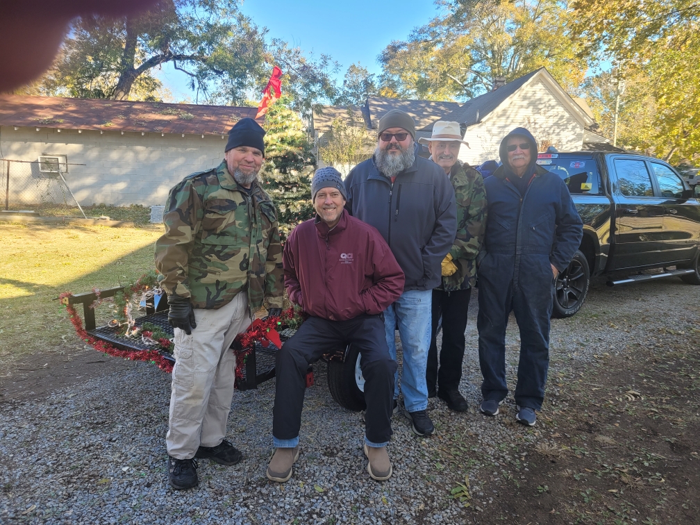 Members of the Prattville Dragoons braves temperatures in the 30s on Friday night to man the SCV Camp 1524 float for the Prattville city Christmas parade. Members gathered on Friday morning in similarly chilly temperatures to decorate the float which consisted of a tree with lights and tinsel garland wrapped around it. A garland of greenery and lights with big red bows was attached to the outside frame of the trailer. And at the front was a display of historic flags including the Bonnie Blue, the Dragoons regimental flag, the Alabama Secession flag and the Alabama state flag. The theme of the parade was Stars on Prattville so the stars on the flags as well as a string of star lights for the tree helped keep the float in concert with the motif. Candy was tossed to the children spectating all along the parade route which started on Court Street and then circled about on numerous streets downtown before returning to Main Street and back to Court Street to finish. Members helping with the decorating included Quartermaster Bill Myrick, Comms Officer Doug Butler, Adjutant Wayne Sutherland, Color Sgt John Dennis, Brigade Commander Waldo, and compatriot Rob Schwartz. For the parade, the camp's Christmas banner was affixed to the flagpoles for everyone to see the season's greeting. Members participating in the parade Friday night included Commander Grooms, Comms Ofc Butler, Quartermaster Myrick and compatriot Schwartz.